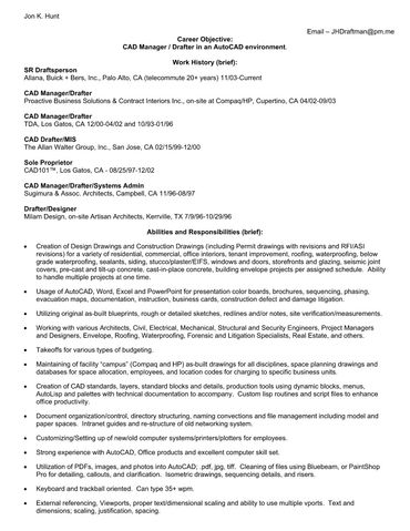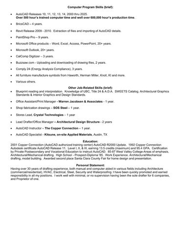 · Strong experience with computer-aided drafting using AutoCAD (spans AutoCAD Releases 10 through 2025, with over 500 hours of trained computer time and more than 600,000 hours of production time), along with proficiency in Office products and an excellent computer skill set. Keyboard and trackball oriented, able to type at a speed of 35+ wpm.